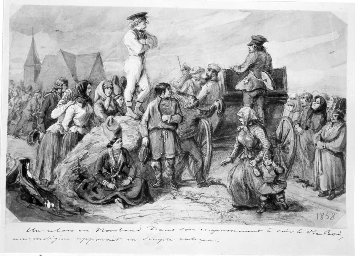 Akvarellerad tuschteckning av Fritz von Dardel från 1858. Människor i rörelse, män, kvinnor och barn. Möjligen på resa i Norrland. I scenens mitt står en kärra, i bakgrunden en kyrka. På marken sitter en samisk kvinna.