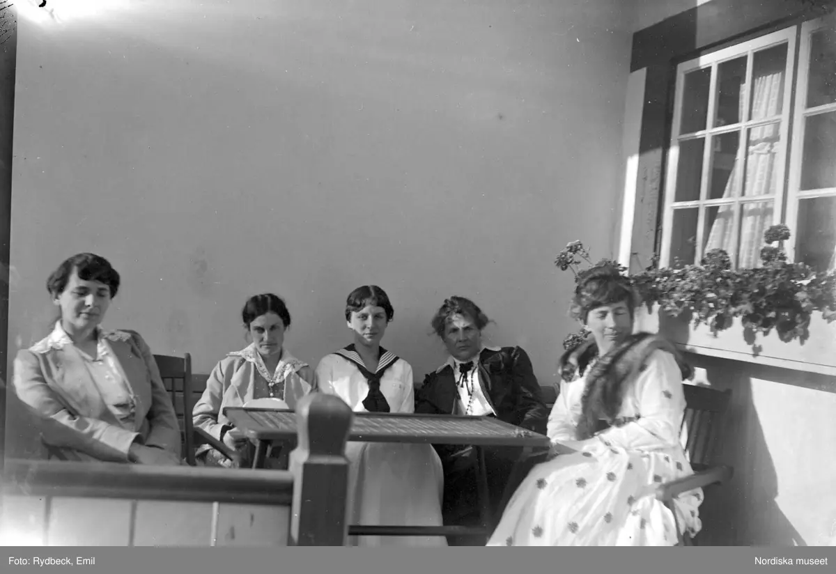 Gruppbild av Sigur, Ingrid, Elsa, Hilden Rydbeck och Ingeborg Olson i Osean villan vid verandan, Djurholmen.