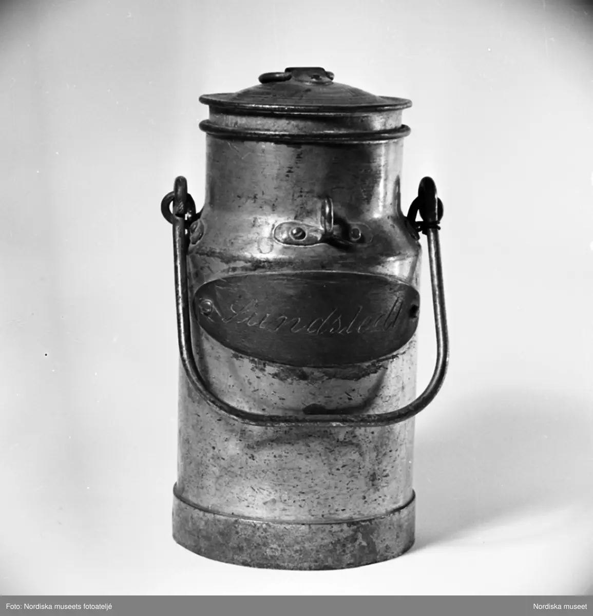 Mjölhämtare av bleckplåt med pånitad mässingsplåt med texten "Sundstedt". Nordiska museet inv.nr 207308