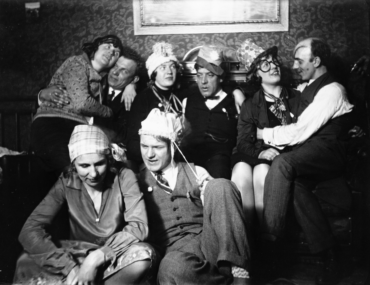 "Grupp hos Ekegrens, Bondegatan 7". Sällskap på maskerad.