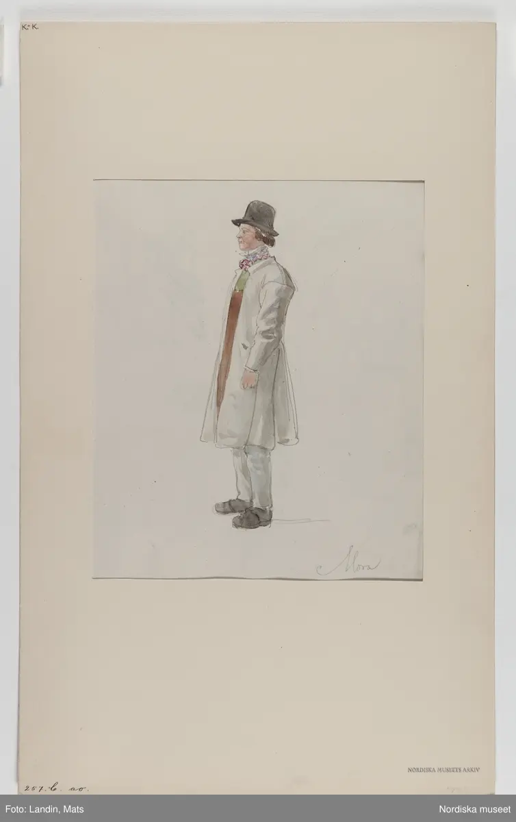Akvarellerad handteckning. Mansdräkt från Mora, Dalarna. Svag blyertsanteckning i nedre högra hörnet: "1857". Mannen bär en hatt, den blå/röd/vita alsdutjen (halsduken), grön väst, en lång waittråjö (långrock), samt långbyxor och skor.