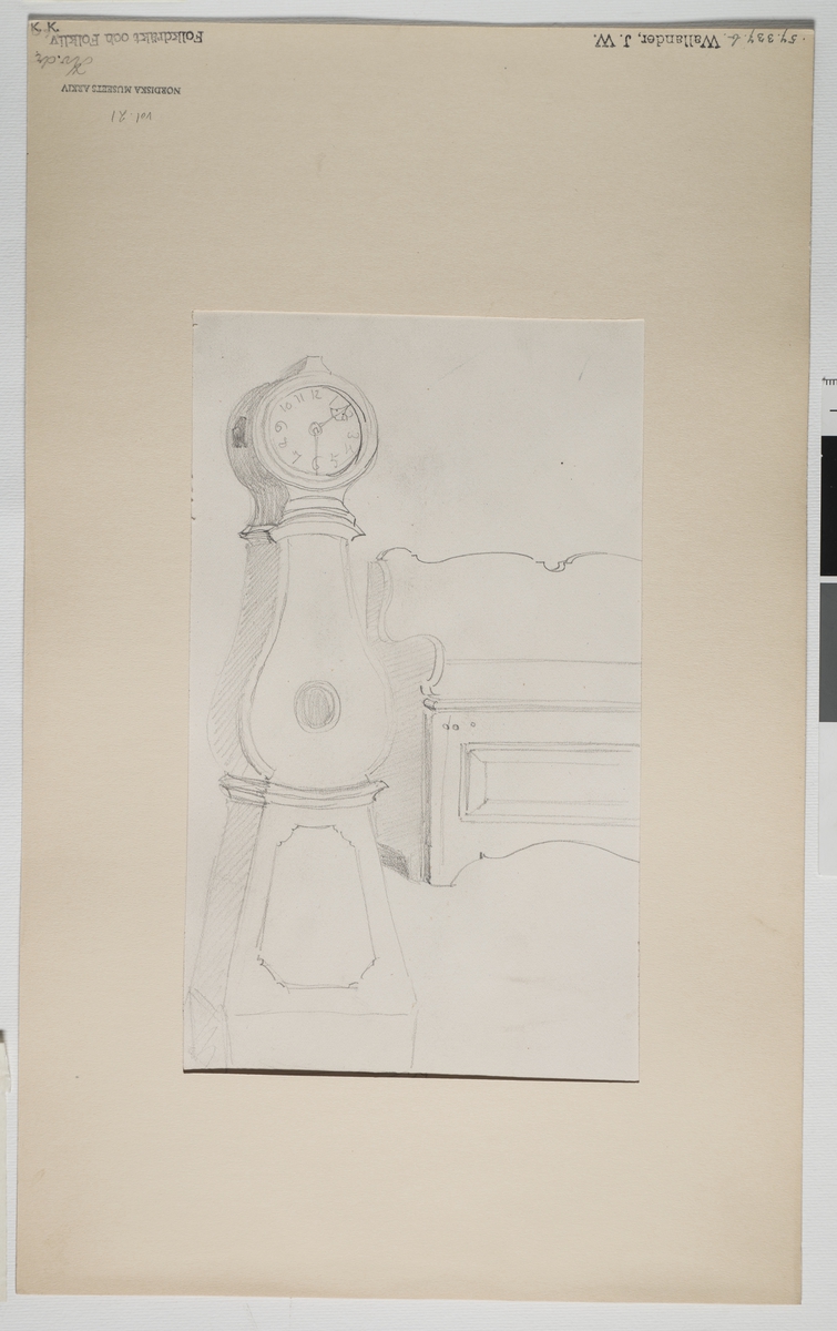 Handteckning av J. W. Wallander ur skissbok NM.0057337. Ståndur och säng.