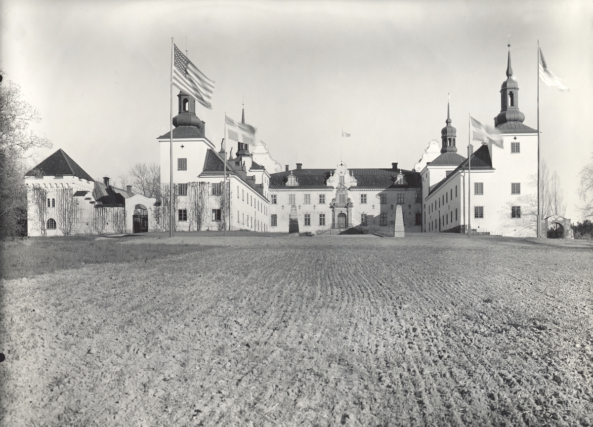 Tyresö slott från entrésidan. Gårdsplanen är krattad och framför byggnaderna vajar svenska och amerikanska flaggor.