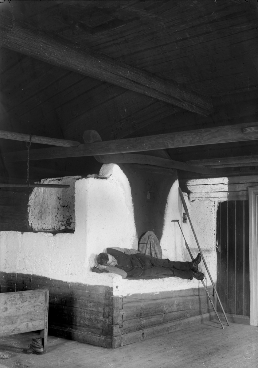"Värmland, Östmark socken, Johala. Interiör av rökstuga. Den yngsta av de ägande bröderna, Johannes Jonsson, liggande på ugnen."