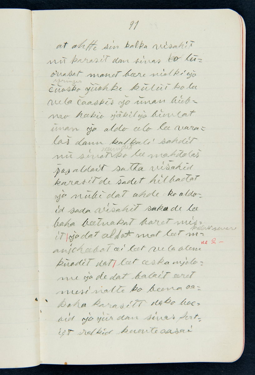 Fotografi av sida ur manus/anteckningsbok nr. 1 av Johan Turi till muittalus samiid birra. Sid. 91