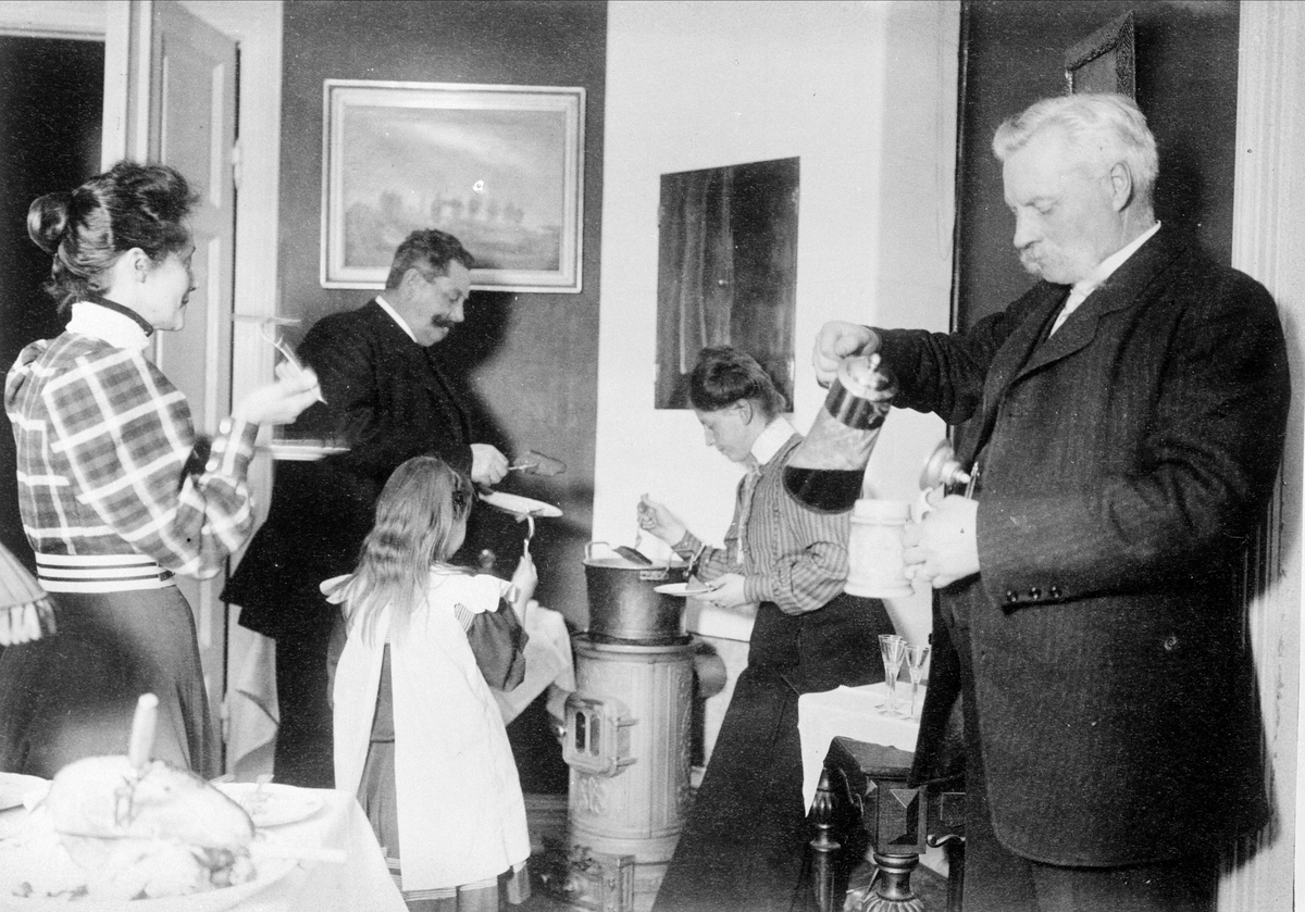 Jul. Dopp i grytan. Familj doppar i bröd i gryta med skinkspad som står på järnkamin. I förgrunden häller äldre man upp mumma i ett stop.