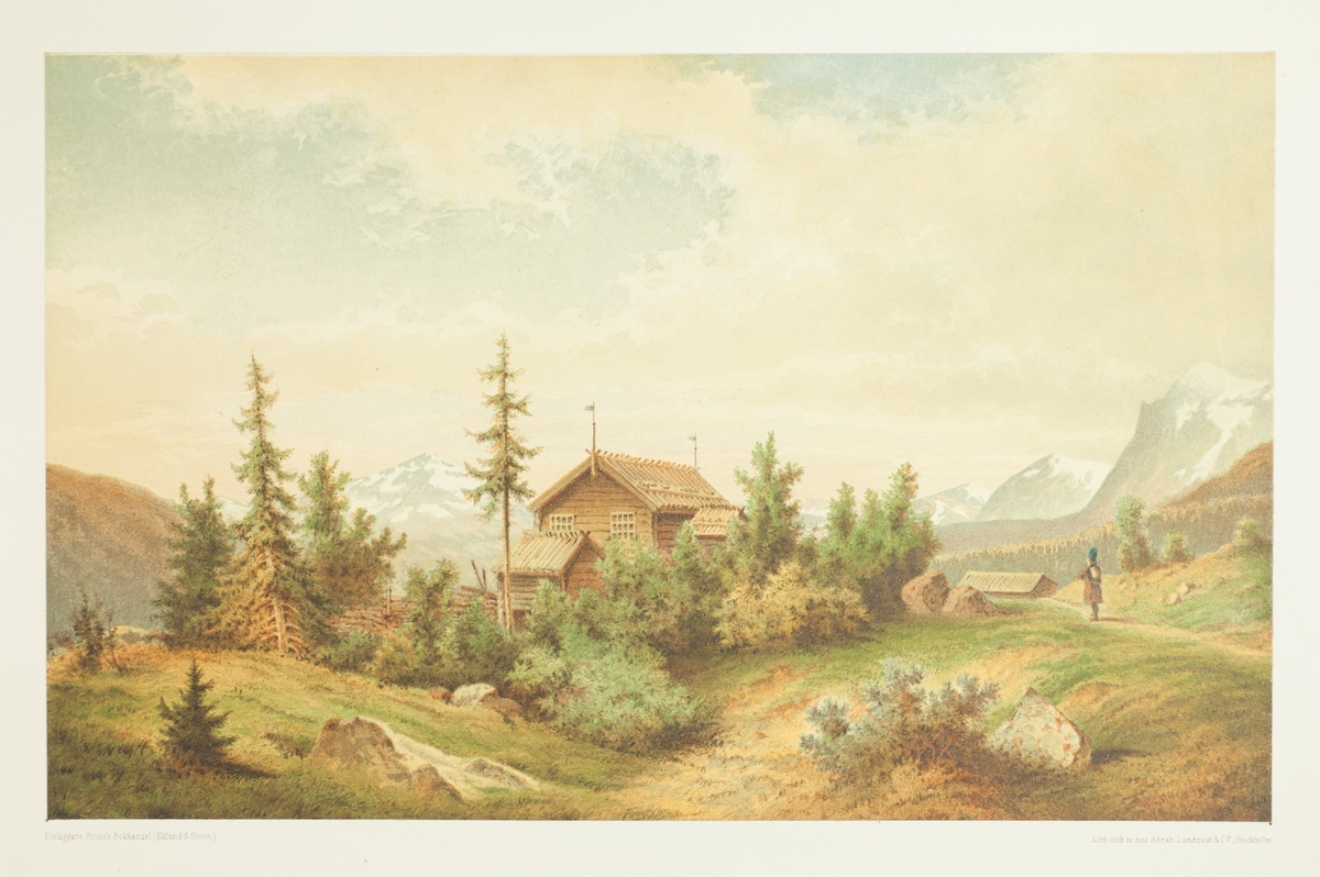 Färgtryck. Vy över fjällandskap med kyrka, en man går på en väg. Motivet "Qvickjocks kapell" är hämtat ur Carl Anton Petterssons planschverk Lappland, dess natur och folk från 1866.
