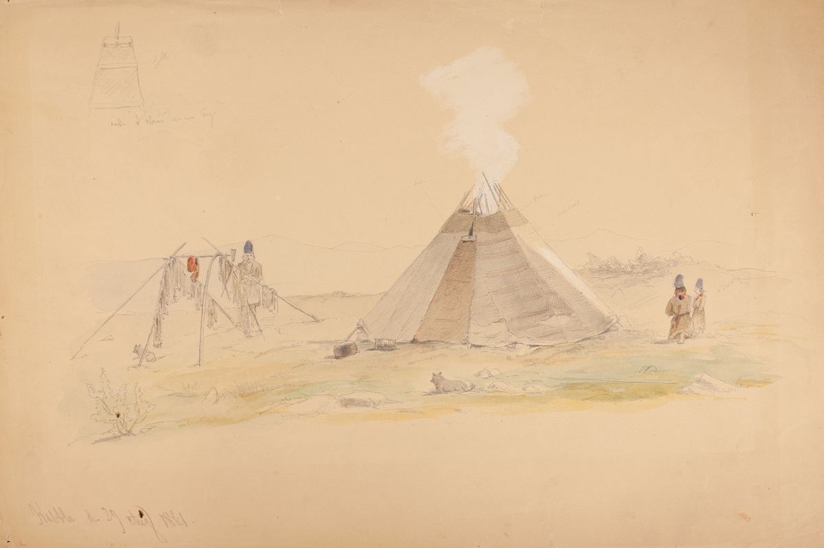 Teckning. "Kabbla d. 29 Aug 1861." Kåta, familj och djur. L.A. 1657. Sannolikt av P Holm under resa i Jokkmokks socken 1861.