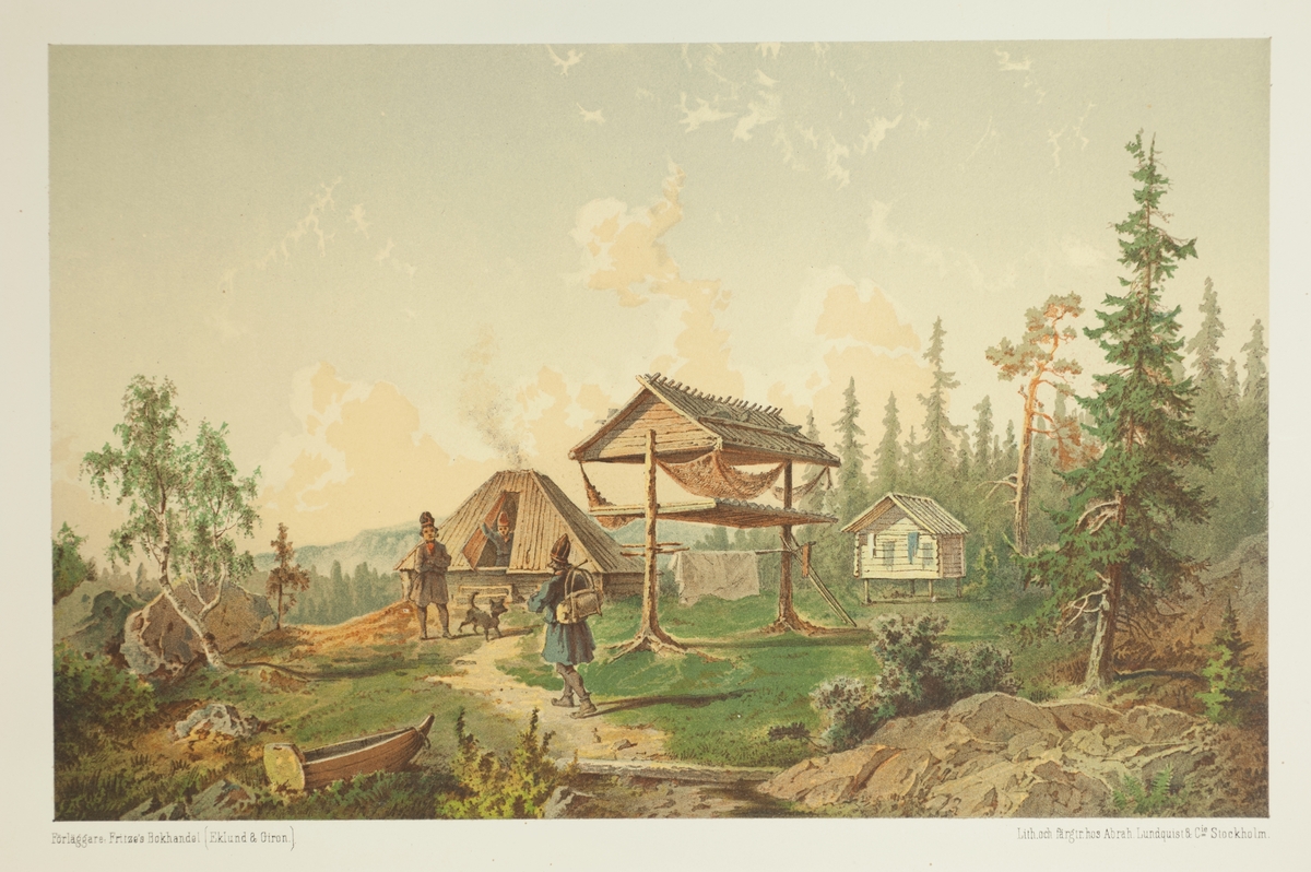 Grafiskt färgtryck. Samisk bostadsplats i skogen. Motivet "Skogs-Lappar" publicerat i Carl Anton Petterssons planschverk Lappland, dess natur och folk, 1866.