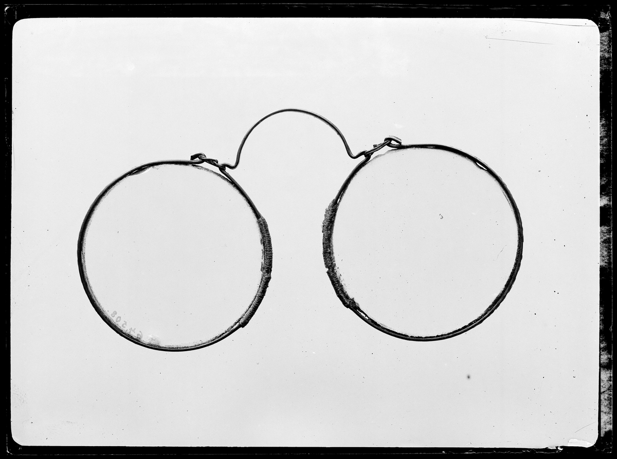 Observera hur fattningar och båge gjorts av en enda metalltråd, som på två ställen lindats i silke för att metallen ej skulle svärta näsan. Funna under golvet i Norrby kyrka, Uppland. Inv nr 64508.