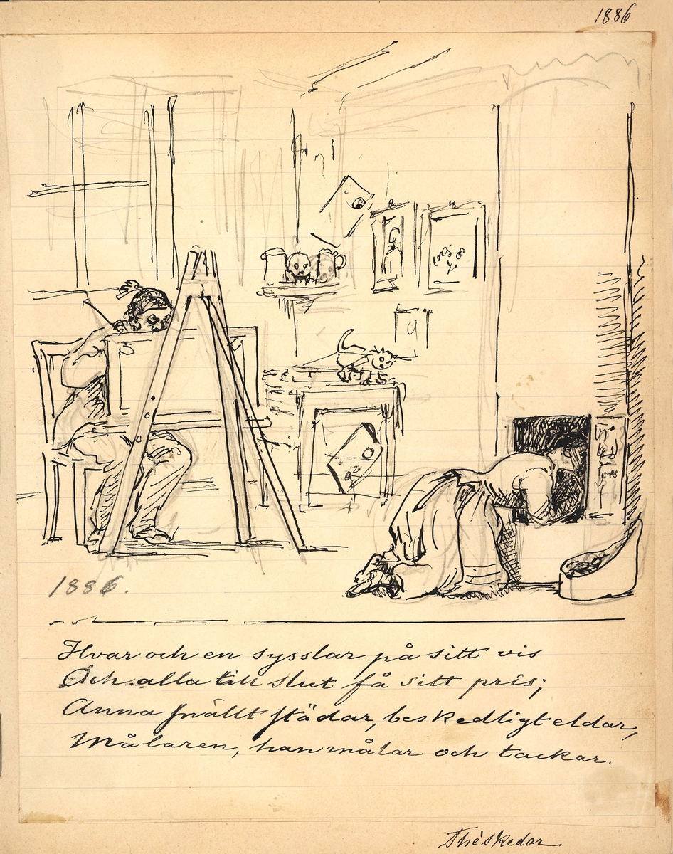 Tuschteckning av Fritz von Dardel från 1886. En kvinna i förkläde ligger på knä framför en kakelugn. I bakgrunden sitter en man bakom ett staffli. "Hvar och en sysslar på sitt vis Och alla till slut får sitt pris; Anna snällt städar; beskedligt eldar, målaren, han målar och tackar."