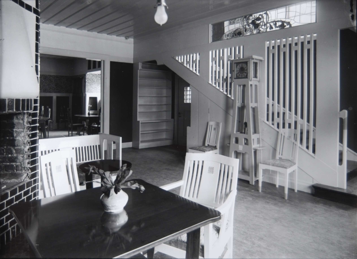 Interiör från Pressens villa, Källvägen 2, Saltsjöbaden, Nacka. Vardagsrummet med öppen spis, väggfast bokhylla och spjälvägg framför trappan till övervåningen. Arkitekt Carl Westman, 1902.