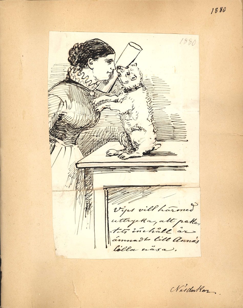 Teckning av Fritz von Dardel. En hund sitter på bakbenen på ett bord och sträcker fram ett paket han bär i munnen mot en kvinna. "Vips vill härmed uttrycka att paketets innehåll är ämnadt till Annas lilla näsa." "Näsdukar"