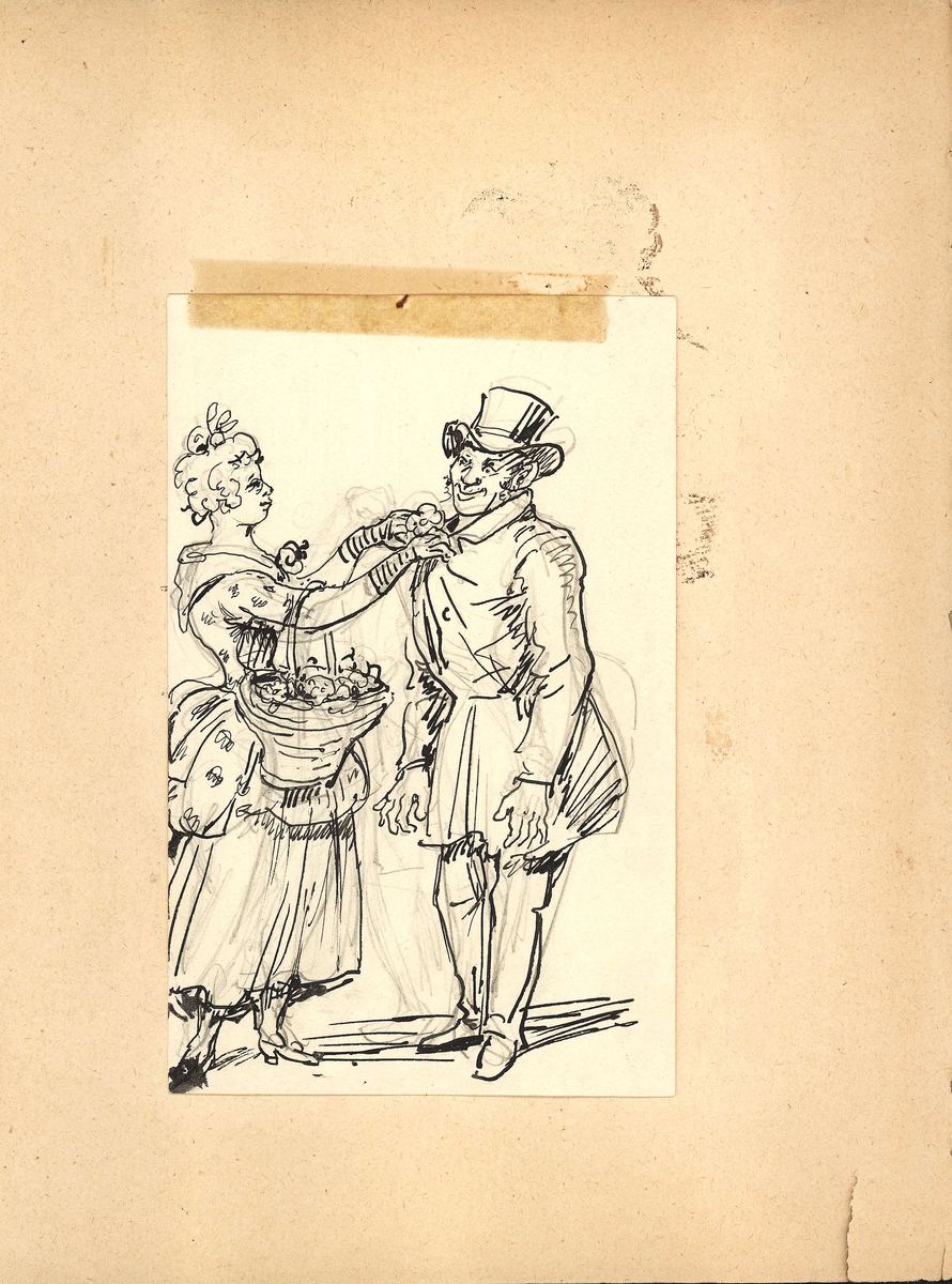 Teckning, Fritz von Dardel. En kvinna fäster en blomma på en herres rockslag.