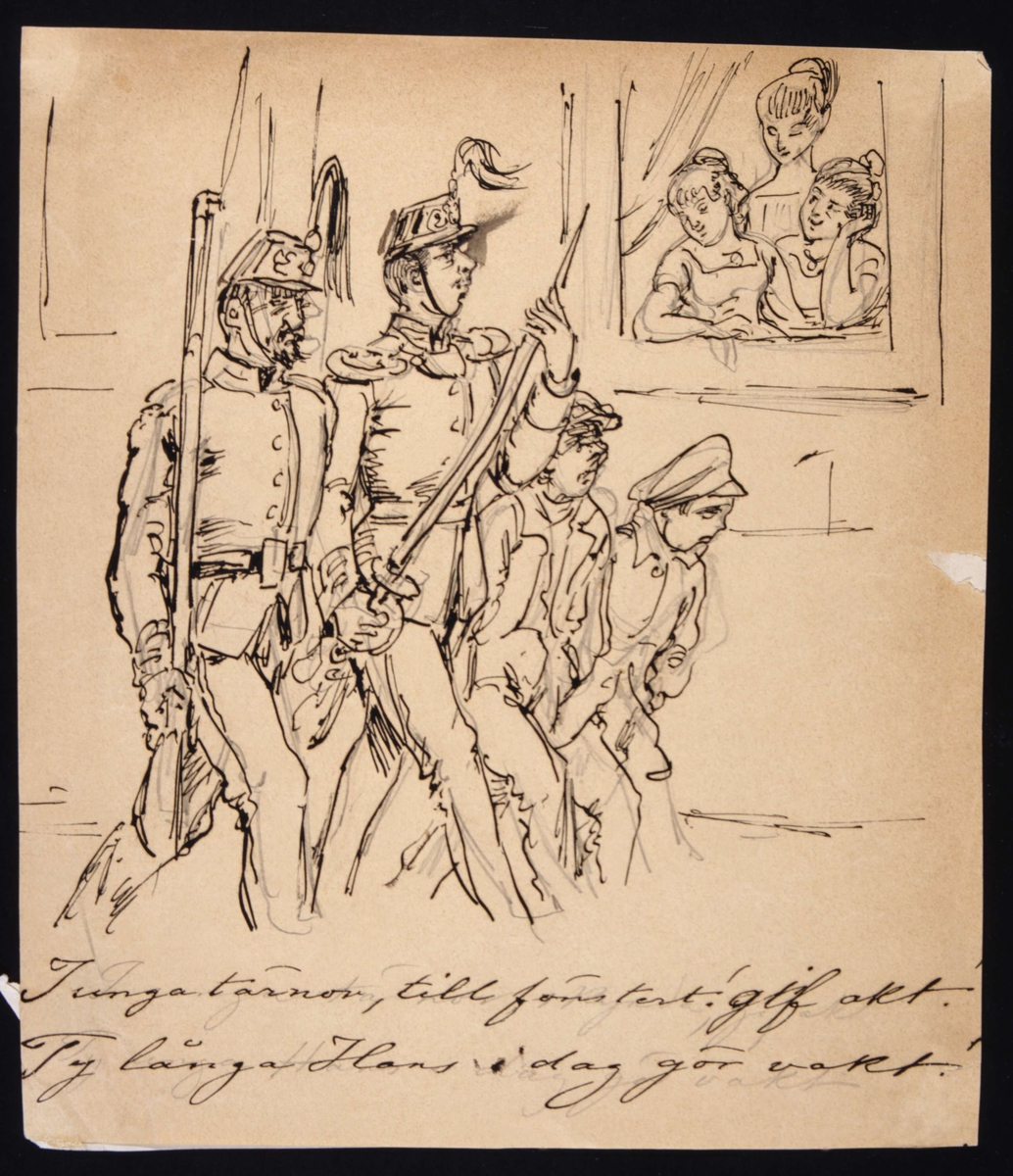 "I unga tärnor till fönstret. Gif akt ty långa Hans i dag gör vakt". Tuschteckning av Fritz von Dardel