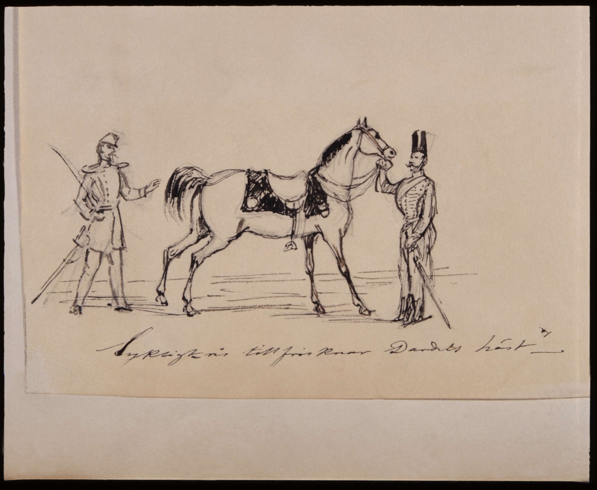 "Lyckligtvis tillfrisknar Dardels häst". Tuschteckning av Fritz von Dardel.