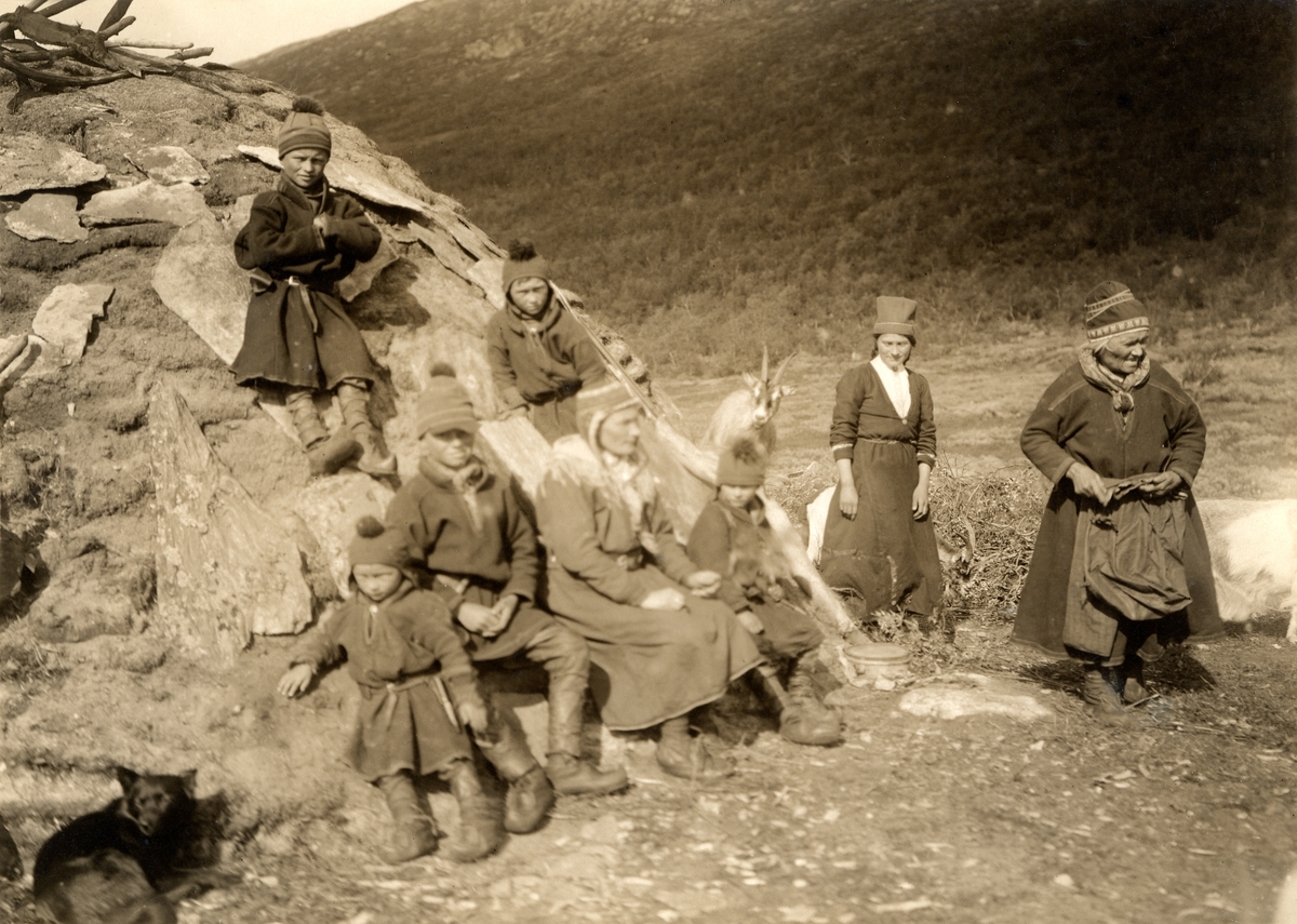 En grupp kvinnor och barn intill en kåta vid Staloluokta.