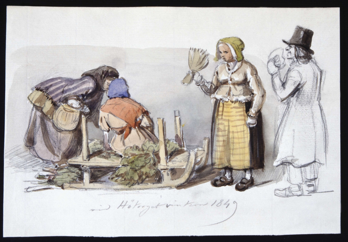 "Hötorget vintern 1849". Akvarellerad teckning av Fritz von Dardel.
