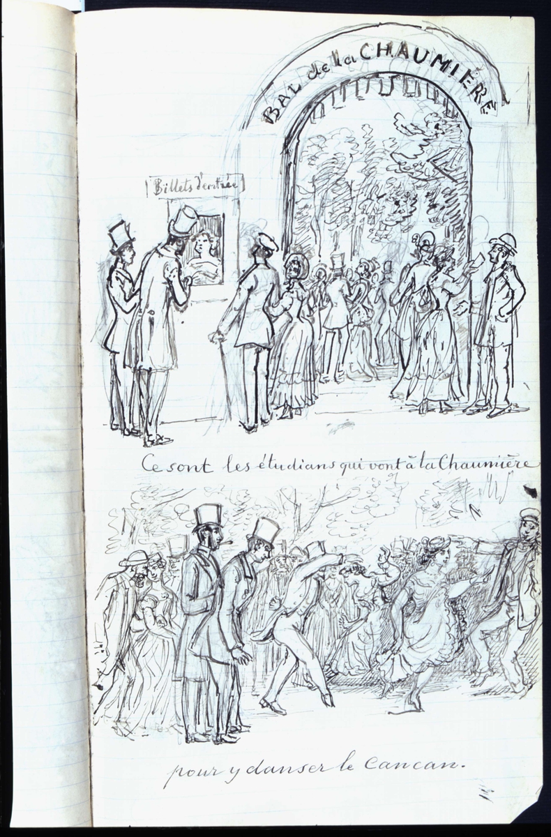 Bal de la Grand-Chaumière, Paris. "Ce sont les étudiants qui vont á la Chaumière pour y danser le Cancan. Köbildning utanför biljettkassa till ett etablissemang där det dansas cancan. Tuschteckning av Fritz von Dardel, 1840