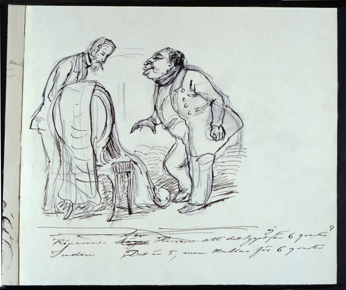 "Köparen: ser herrn att det tyget ej är 6 qvarter. Juden: det är 5 men kallas för 6 qvarter". Tuschteckning av Fritz von Dardel.