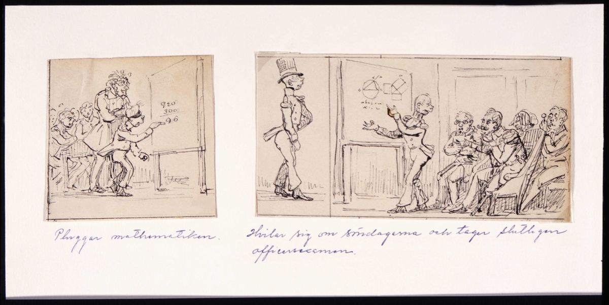 Ur "Sparfs äfventyr." "Pluggar mathematiken. Hvilar sig om söndagarna och tager slutligen officersexamen". Tusch av Fritz von Dardel, 1840