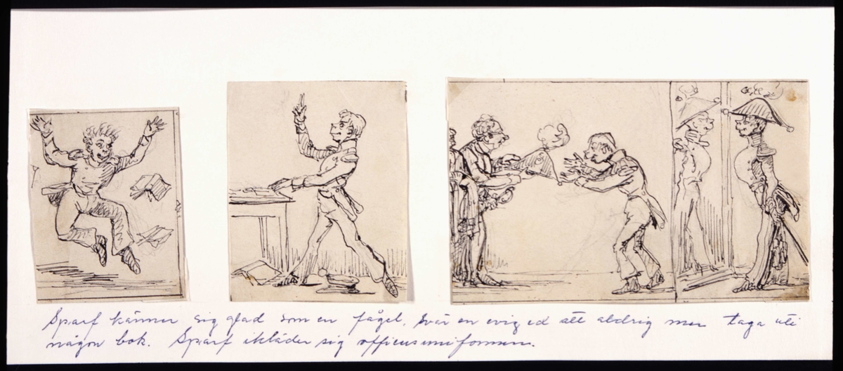Ur "Sparfs äfventyr." "Sparf känner sig glad som en fågel, svär en evig ed att aldrig mer taga uti någon bok. Sparf ikläder sig officersuniformen". Tusch av Fritz von Dardel, 1840