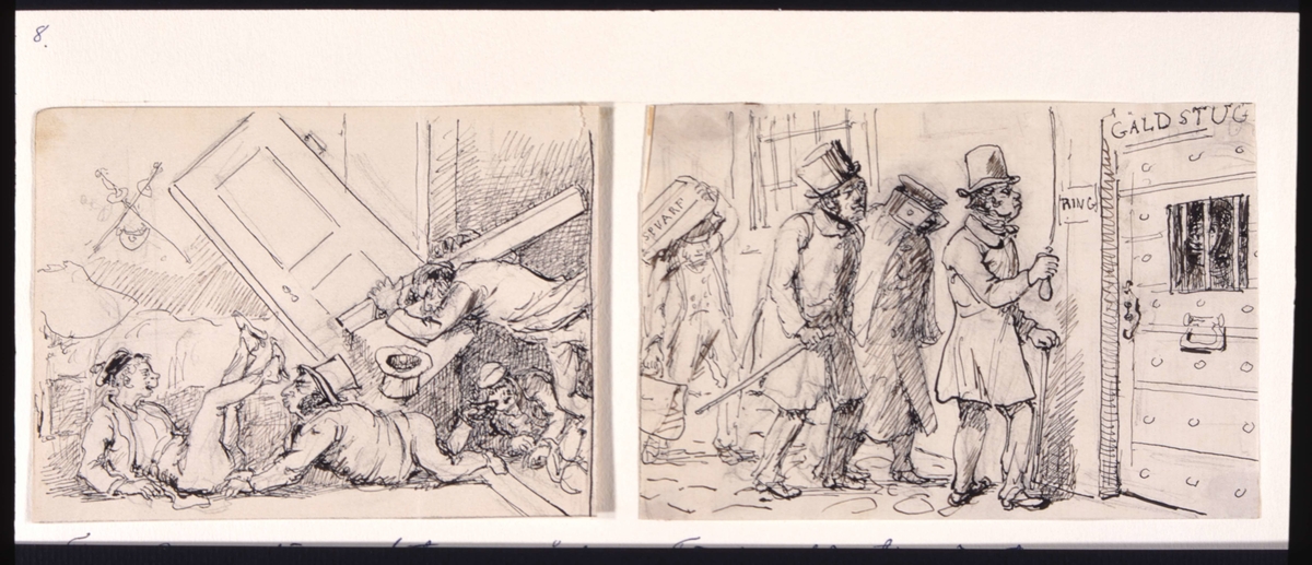Titel: Ur "Sparfs äfventyr". Tusch av Fritz von Dardel, 1840