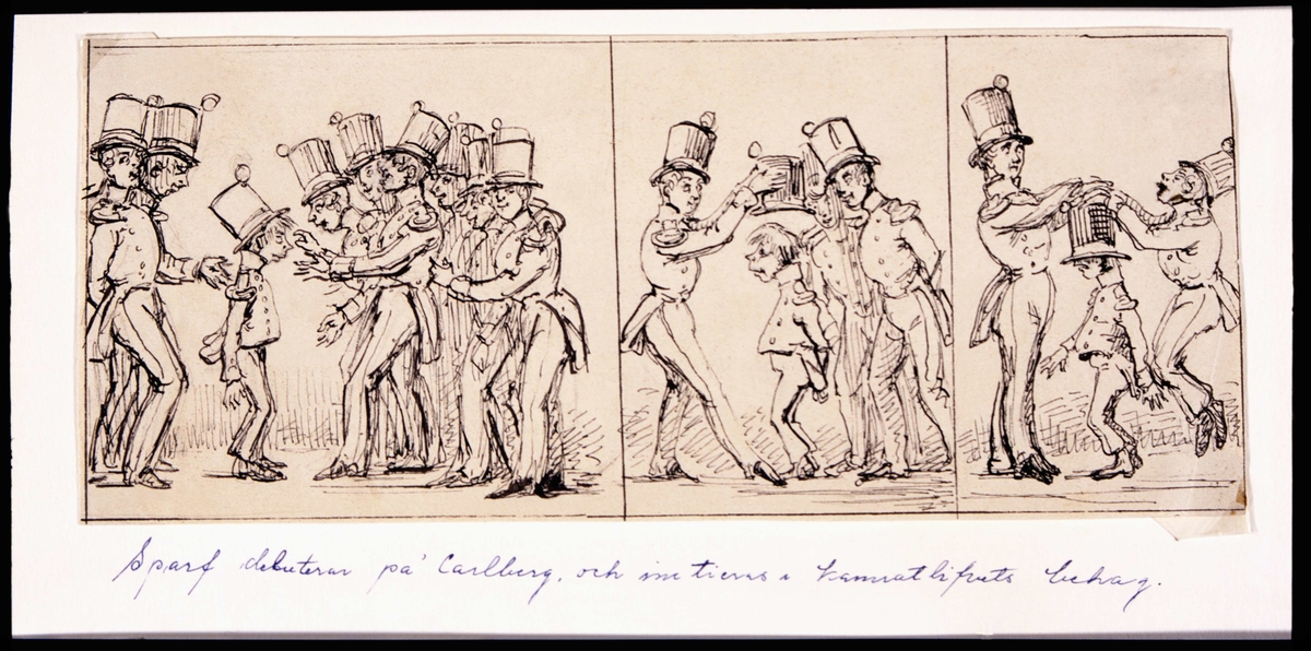 Ur "Sparfs äfventyr." "Sparf debuterar på Carlberg och initeras i kamratlifvets behag". Tusch av Fritz von Dardel, 1840