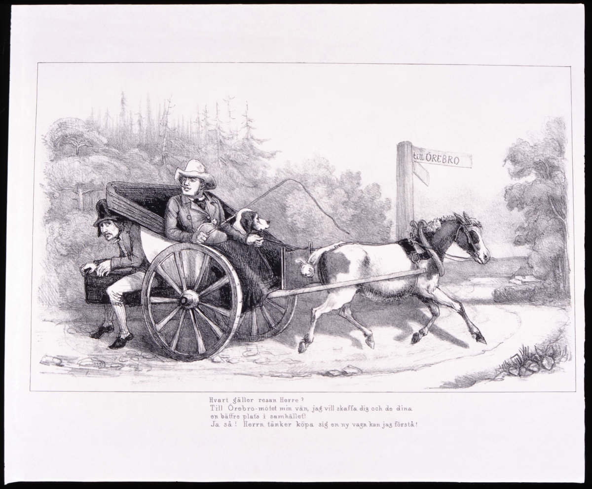 "Hvart gäller resan Herre? Till Örebro-mötet min vän, jag vill skaffa dig och de dina en bättre plats i samhället! Ja så! Herrn tänker köpa sig en ny vagn kan jag förstå!". Litografi av Fritz von Dardel