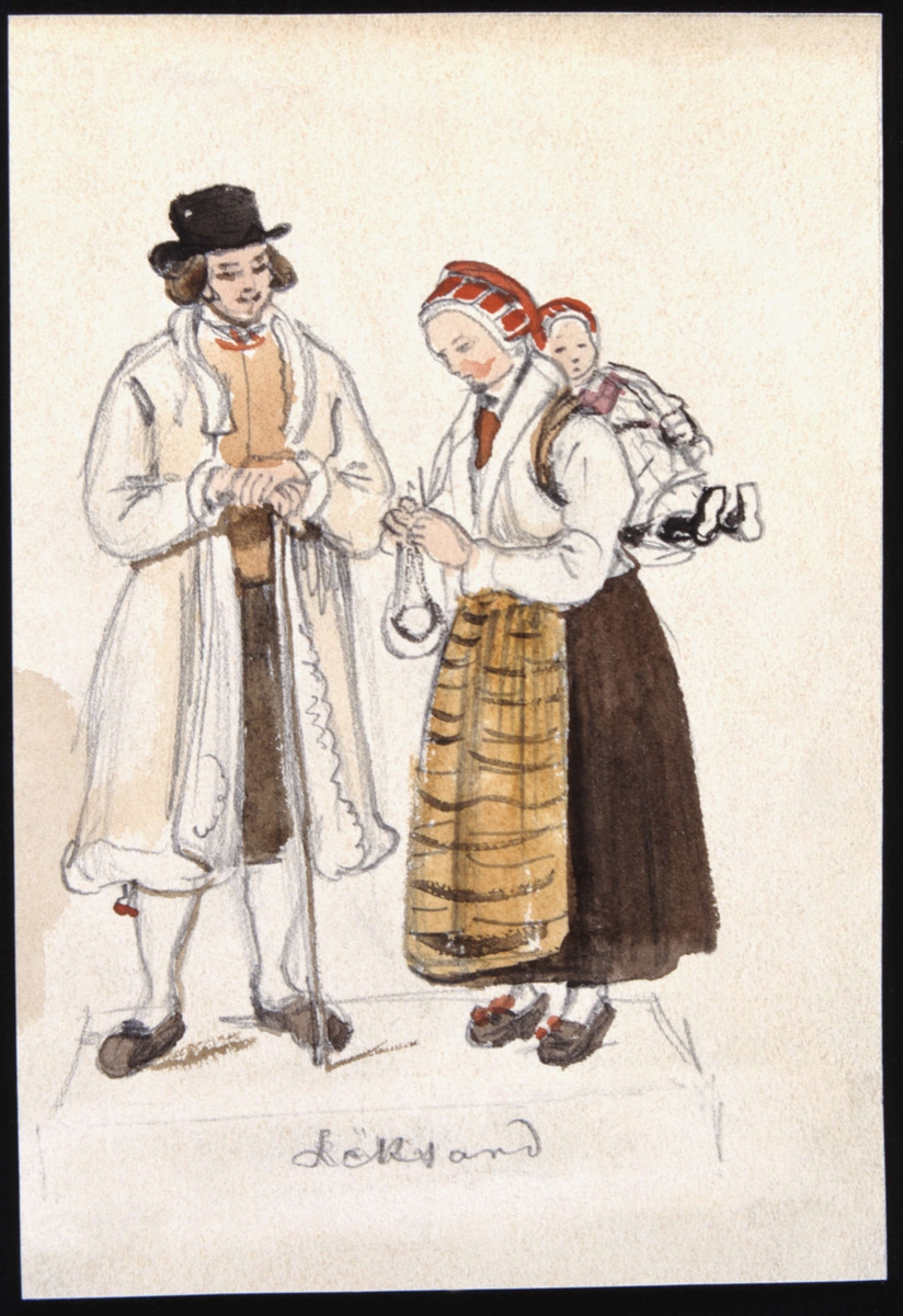 Man i vit rock, kvinna med barn på ryggen. Akvarell av Fritz von Dardel