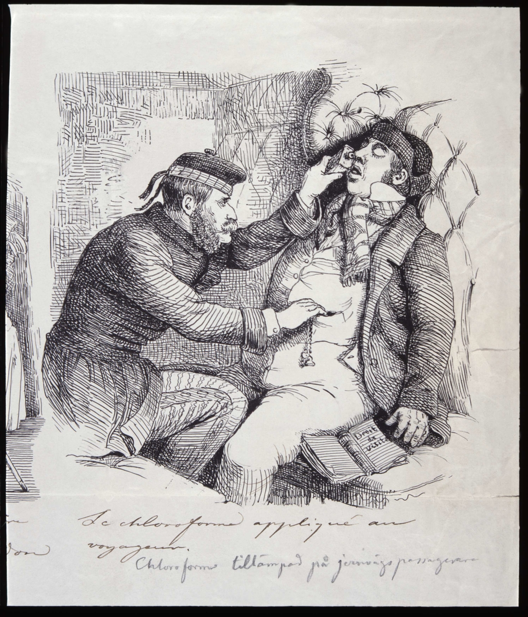 Ficktjuv på tåg. "Chloroform tillämpad på järnvägspassagerare". Tusch av Fritz von Dardel