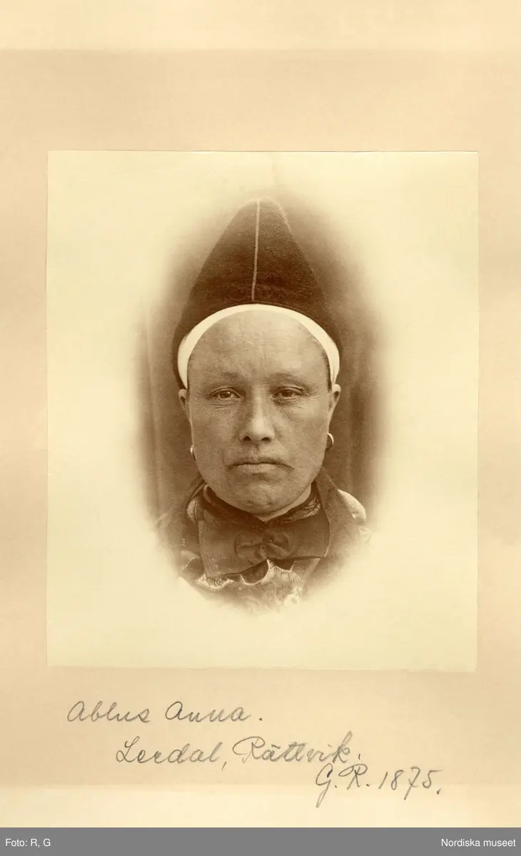Porträtt av Ablus Anna, Lerdal, Rättvik i Dalarna iklädd folkdräkt.