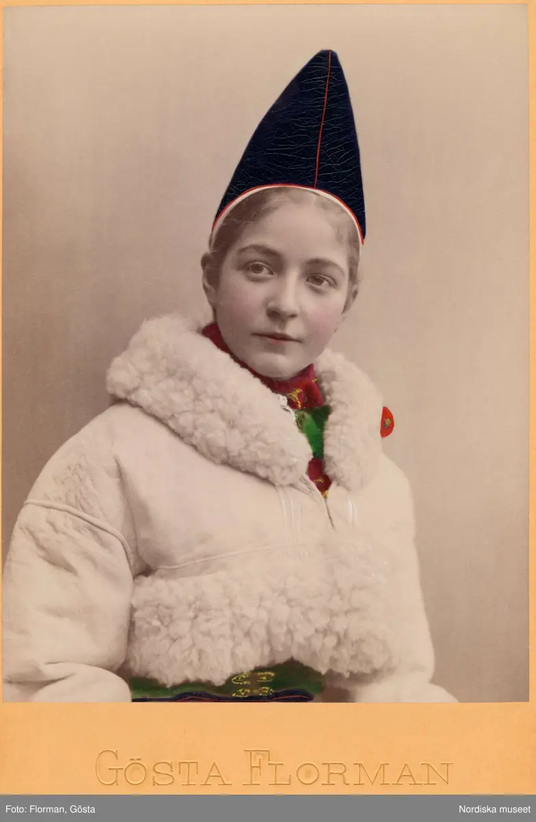 Bröstbild av en ung kvinna i folkdräkt från Rättvik i Dalarna, med en pälsbesatt vit jacka. Kolorerat fotografi.