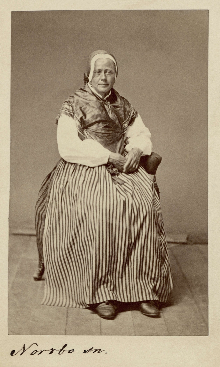 Norrbo (antagligen)." Kvinna poserar i en sockendräkt