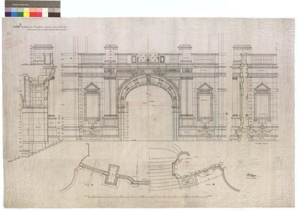 mittenpartiet portalen mellan vestibulen och hallen. Donatorer. Sektion, plan. Kröningsläktaren. 70x106,5 cm. Tusch, rött, gult, blått och brunt. Linjalritning, fri hand. I Gust Clason 15 Mars 1905.