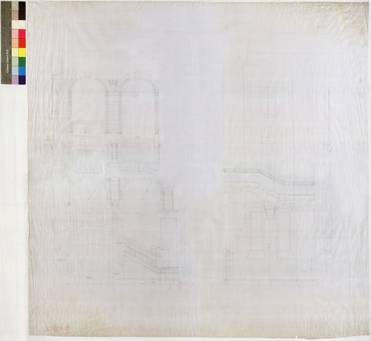 Ritning på väv över Nordiska museets huvudbyggnad. Underlag till No 107. Vestibulen. Tvärsektioner genom trapphuset. Sektion. Vestibulen, stora trappan. 70x99 cm. Blyerts. Linjalritning. Osignerad.