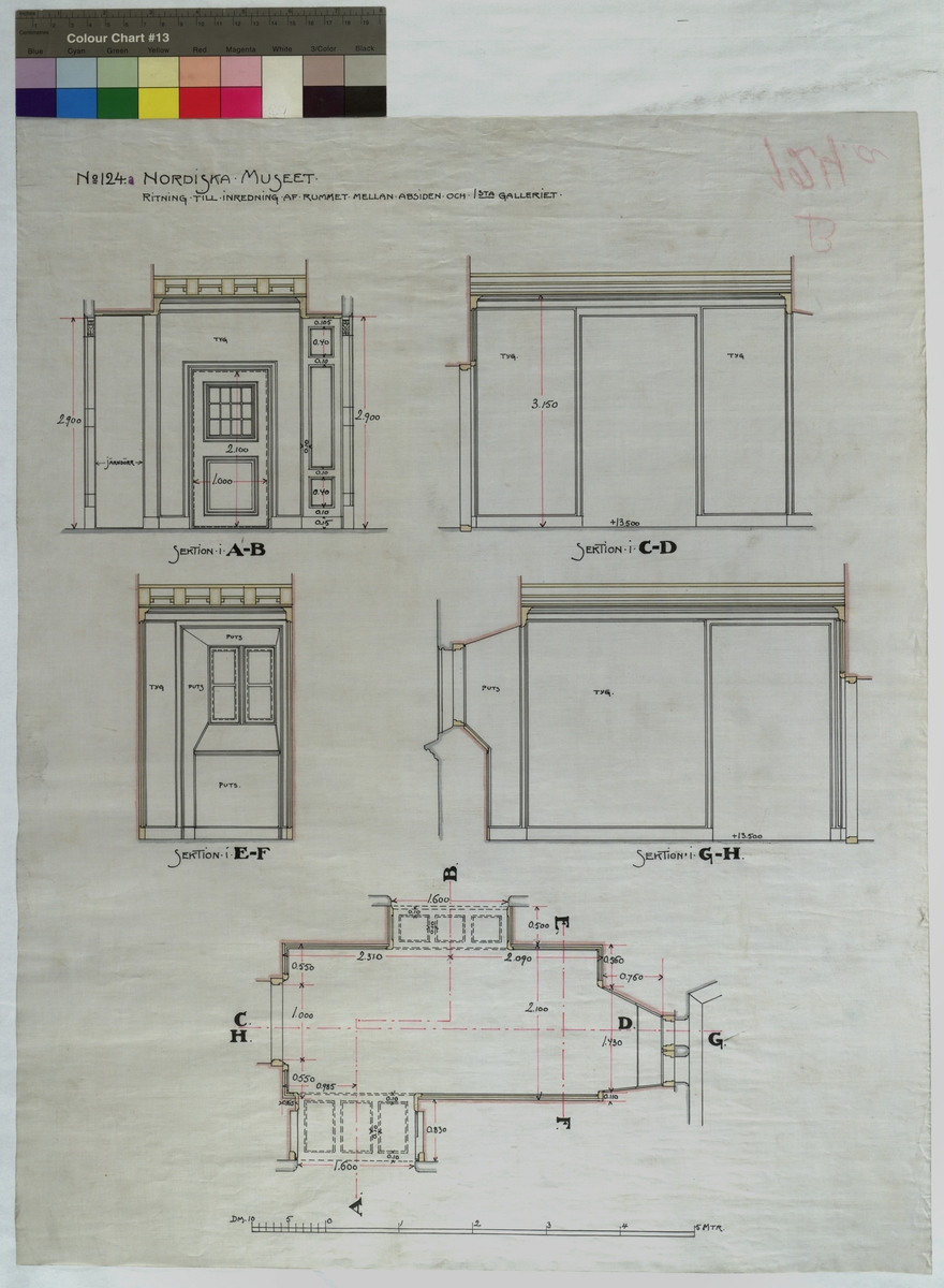 Ritning på väv över Nordiska museets huvudbyggnad. Ritning till inredning av rummet mellan Absiden och 1:sta galleriet. Plan, Sektion. Panel, Entresol, Tjänsterum. 62x49,5 cm. Tusch, rött, gult och grått. Linjalritning. Osignerad.