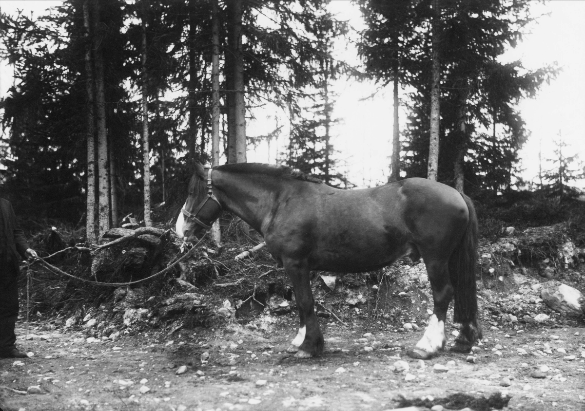 Häst." Man håller i en häst på en skogsväg