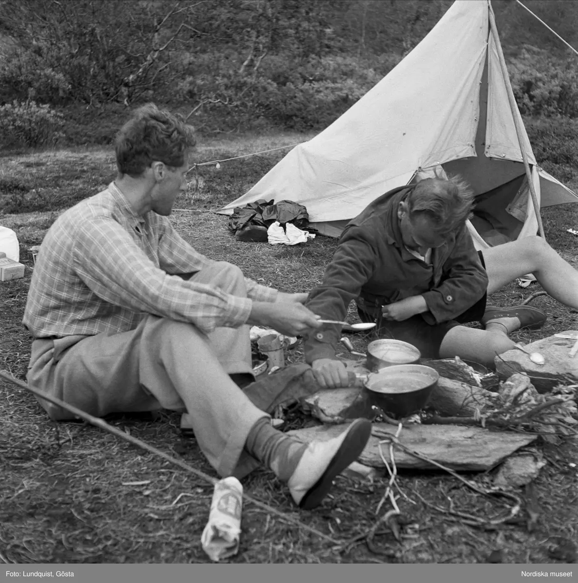 Dag Hammarskjöld och Sverker Åström på fjällvandring på Sulitelma. Två män har slagit läger och rest tält. Nu lagar de mat över eld.