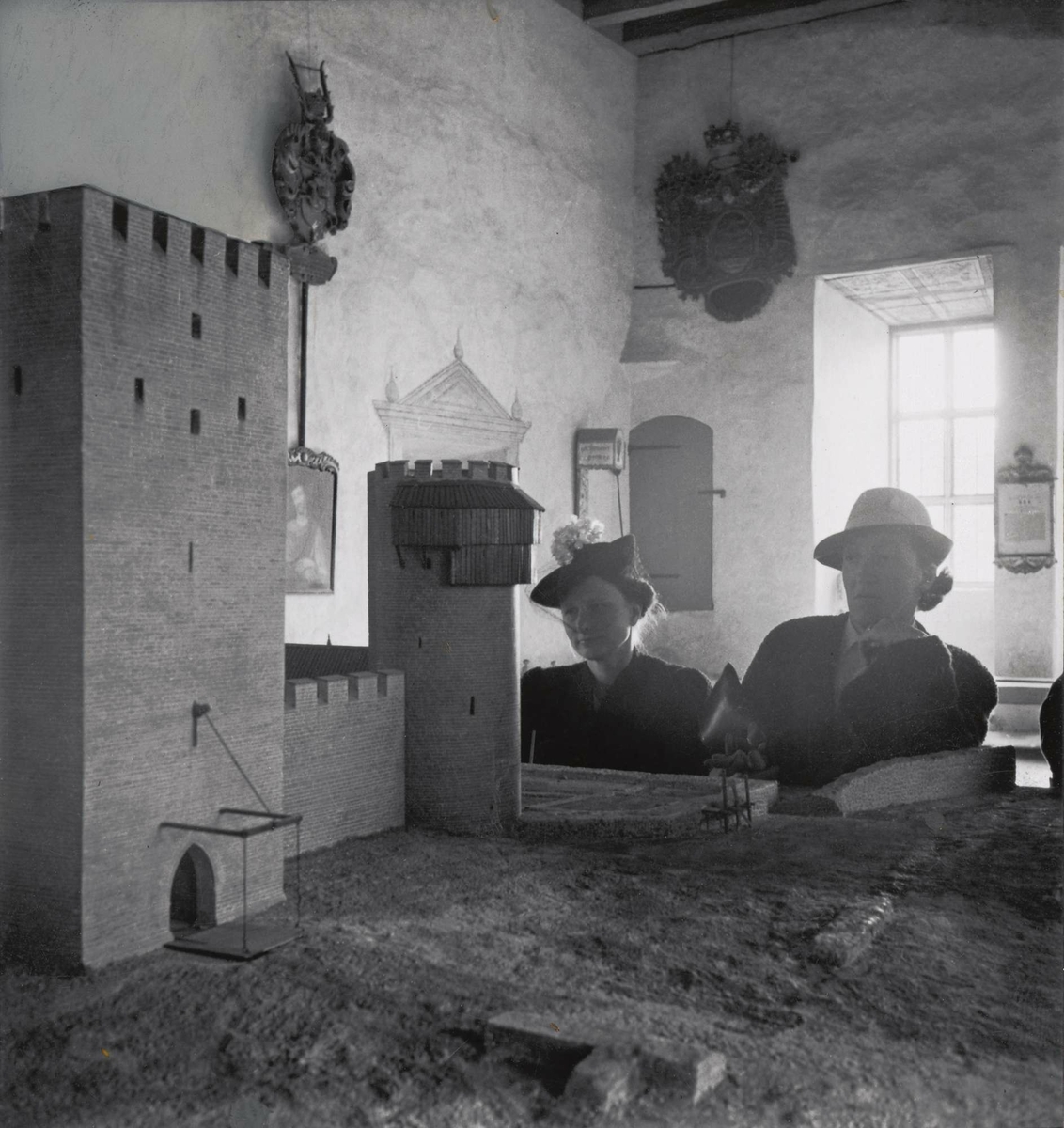 Interiör från Kalmar slott. Två kvinnor i hatt betraktar en modell av slottet som det såg ut år 1520.