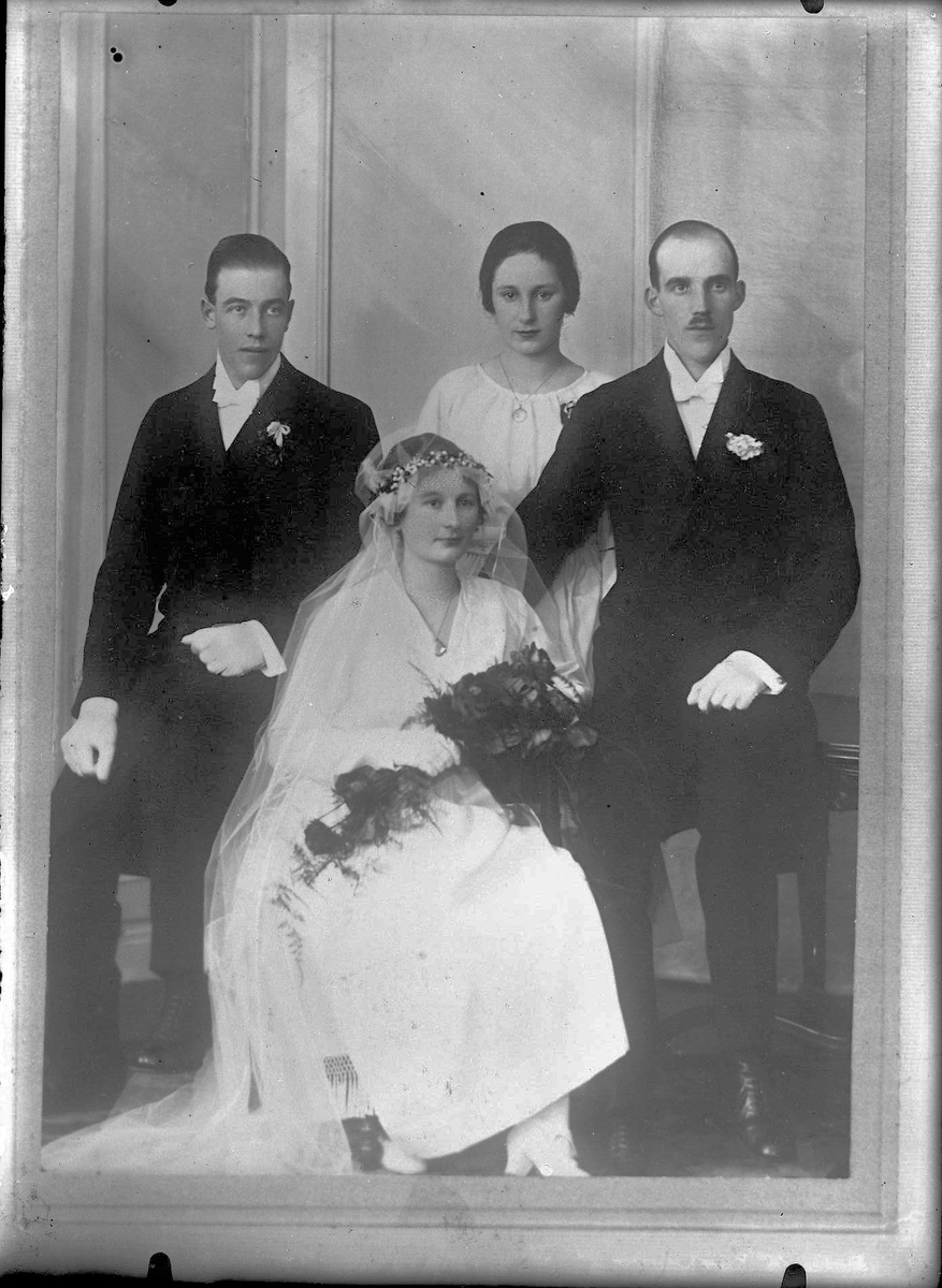 Porträtt av ett brudpar samt ytterligare en kvinna och en man. Lima, Dalarna
