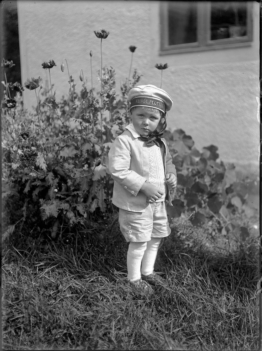 Helporträtt av en liten pojke i ljus dräkt och sjömanshatt i utomhusmiljö. Lima, Dalarna