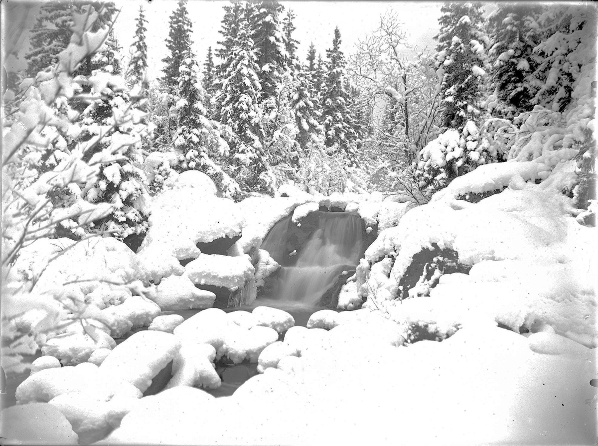 Vinterbild från början av 1900-talet.. En liten vattenfall i skogen.