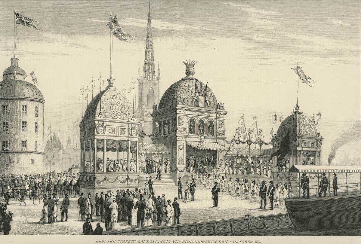 Tryck. Kronprins Gustavs och Viktorias av Baden förmälning 1881. Kronprinsparets landstigning vid Riddarholmen den 1 oktober 1881"