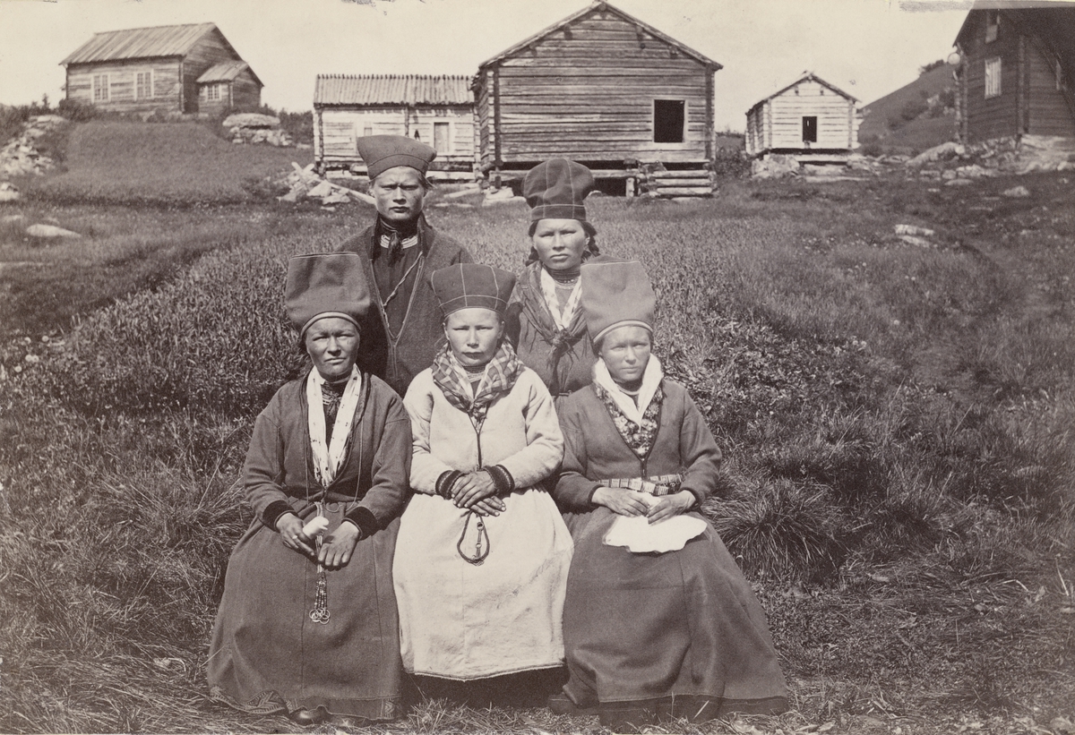 Gruppbild. Fem kvinnor framför timrade byggnader i Ammarnäs juli 1871.