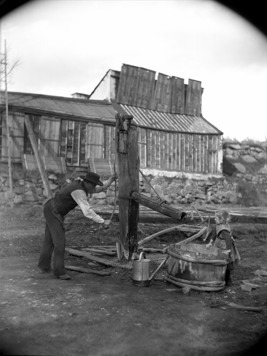 En man som pumpar vatten och en liten flicka vid en gammal pump. Variant på fotot "Den gamla pumpen" (Stockholms stadsmuseum). Där med två kvinnor och en pojke. Omkring 1880-1890. Eriksbergsområdet, Ladugårdslands församling, Stockholm.