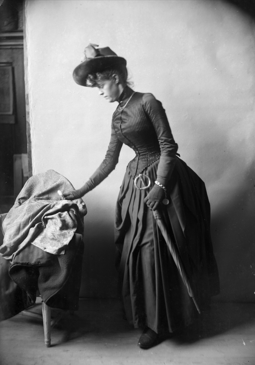 Konstnären och fotografen Severin Nilsons hustru Rosalie Platzman-Eberstein elegant klädd. Ateljétagning. Förlaga till teckning där bakgrunden är utbytt mot natur med träd och berg.