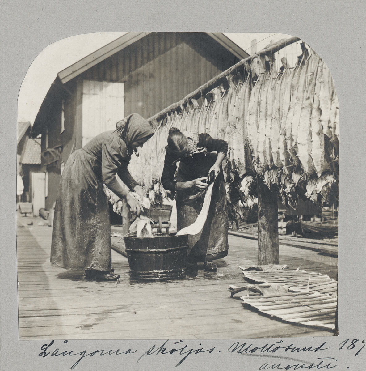 "Långorna sköljas. Mollösund augusti 1899". Två kvinnor sköljer fisk.