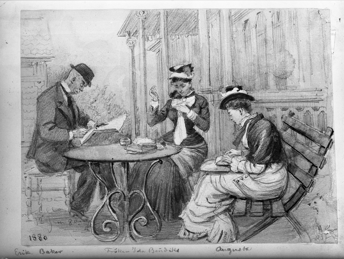 Handarbetande sällskap sitter vid trädgårdsbord, utanför ett hus. En kvinna syr, en kvinna knypplar och en man läser en tidning (eller skriver). Avfotograferad akvarellerad teckning (21.7 x 16.2 cm.) av Fritz von Dardel (1817 - 1901). Daterad 12 juni 1880. Montebello, Östra Ryds socken, Danderyds skeppslag i Uppland.