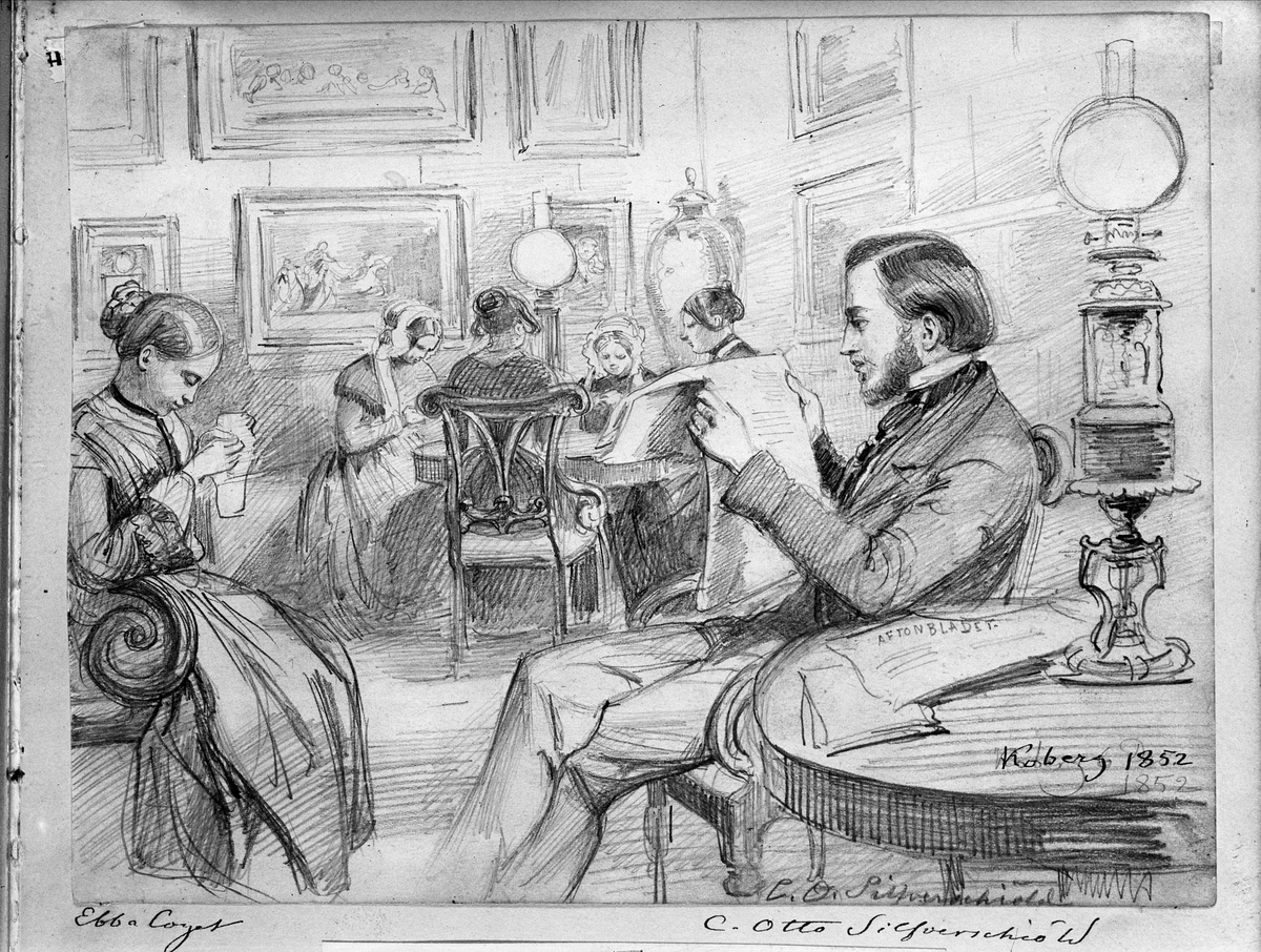Salongsinteriör från Kobergs slott, Lagmansereds socken, Bjärke härad i Västergötland. Kvinnor och en man sitter i små grupper, kvinnorna handarbetar och mannen läser tidningen, på bordet ligger Aftonbladet. Fotogenlamporna är tända och på väggarna hänger målningar. Blyertsteckning (24x18.4 cm.) av Fritz von Dardel (1817-1901), daterad 1852.